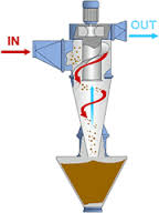 當(dāng)含塵氣流由進(jìn)氣管進(jìn)入旋風(fēng)分離器時(shí),氣流將由直線運(yùn)動(dòng)變?yōu)閳A周運(yùn)動(dòng)。旋轉(zhuǎn)氣流的絕大部分沿器壁自圓筒呈螺旋形向下沿錐體流動(dòng)。含塵氣體在旋轉(zhuǎn)過程中產(chǎn)生離心力,將重度大于氣體的塵粒甩向器壁,沿壁面下落到底部卸料閥排出,將塵粒從氣體中分離出來的一種氣固分離裝置。